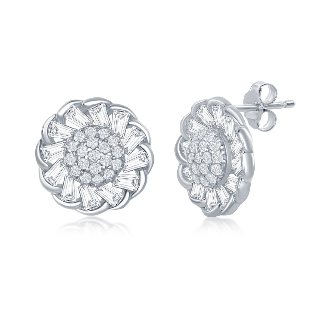 Simona women Sterling Silver Micro Pave Center & Baguette CZ Border Flower Design Stud Earrings