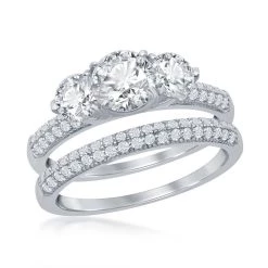 Simona women Sterling Silver Three-Stone Half Micro Pave Band Engagement Ring Set