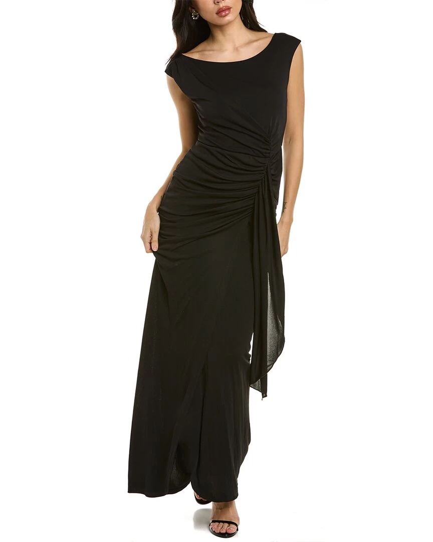 - Gathered Waist Dress In Black With Sash At Left Hip, Left Side Leg Slit, Ruched Back